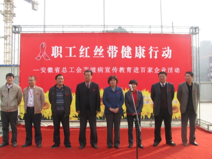 2010年11月24日上午,第23個“世界艾滋病日”即將來臨之際,由安徽省總工會、省建工集團開展的“職工紅絲帶健康防艾宣傳進百家企業活動”在省二建天下錦城二期項目部舉行啟動儀式,省總工會廳級巡視員、省女職工委主任牛和桂,省建工集團工會副主席李鵬飛,工會女職工委主任胡愛紅,省二建黨委書記朱治淮、工會主席李林等出席了啟動儀式。該項目部百余農民工表示,今后要積極主動地加入到預防和控制艾滋病的行動中來,為遏制艾滋病在我省流行蔓延盡到應有的貢獻。