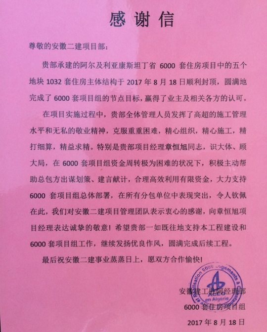 康斯坦丁6000套工程項目是由安徽建工集團獨立總承包的項目,安徽二建公司承擔1032套施工任務,建筑面積10萬平米,合同額2.5億人民幣,此次結構封頂的是其中五個地塊1032套住房。項目部在施工過程中,克服重重困難,科學制定施工方案,合理調配人員設備,精心組織,精細施工,抓管控保優質,始終秉持“建精品、創一流”的建設目標,將工程質量放在第一位。在項目部全體參建員工的努力下,康斯坦丁6000套項目的建設獲得了業主及相關各方的好評。安徽建工駐阿經理部6000套項目組在感謝信中充分肯定了項目部的建設成果,高度贊揚安徽二建項目部高效的管理水平和無私的敬業精神,并特別對安徽二建項目經理章恒旭同志識大體、顧大局的工作作風以及積極主動、建言獻策的工作態度表示感謝。在信的結尾,6000套項目組對今后的合作也提出了期許,希望能夠攜手并進,共創未來。