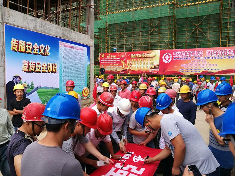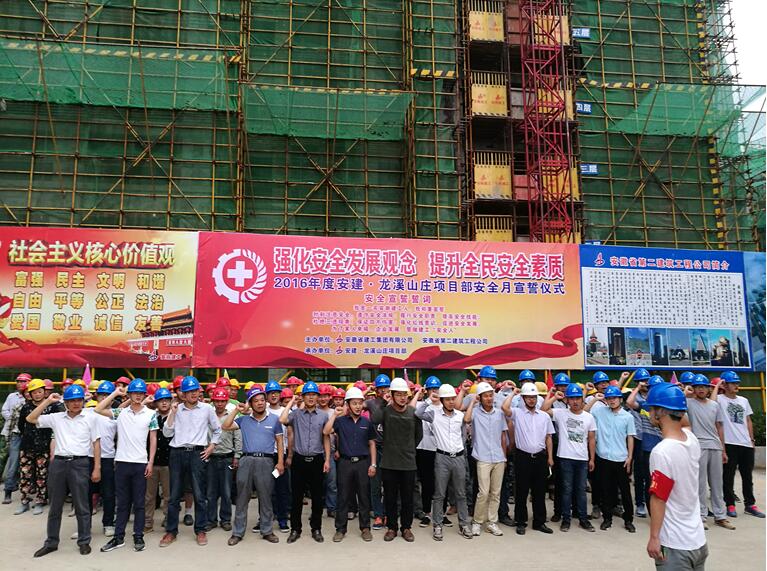 “我是一名安徽建工人,我鄭重宣誓:時刻注意安全,遵守安全法規。履行安全職責,提高安全技能。杜絕三違現象,保證四不傷害。強化紅線意識,促進安全發展……”。嘹亮的宣誓聲響徹整個施工現場,震撼人心。61日早晨7:00,在宿松安建·龍溪山莊工程施工現場,由業主、監理及安建·龍溪山莊項目部員工近百人組成的宣誓隊伍莊嚴宣誓,并簽字承諾,借此拉開“安全生產月”活動序幕。